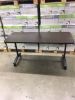 A rolling utility cart with two shelves, a lockable cabinet and a sliding drawer.
